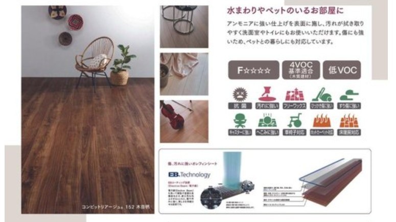 ウッドワンの「コンビットリアージュ」。アンモニアに強い仕上げを表面に施し、汚れが拭き取りやすく洗面室やトイレにもお使いいただけます。傷にも強いため、ペットとの暮らしにも対応しています