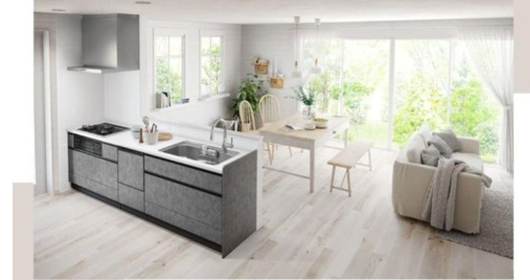 タカラスタンダードのシステムキッチン「オフェリア」。天然素材が持つ風合いを美しく再現しながら、使い勝手にも磨きをかけた、どこまでもスタイリッシュなデザイン。
