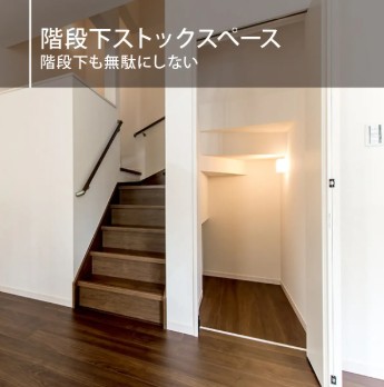 デッドスペースとなってしまう階段下のスペースを有効活動した収納。掃除用具など生活用品の収納に役立ちます。